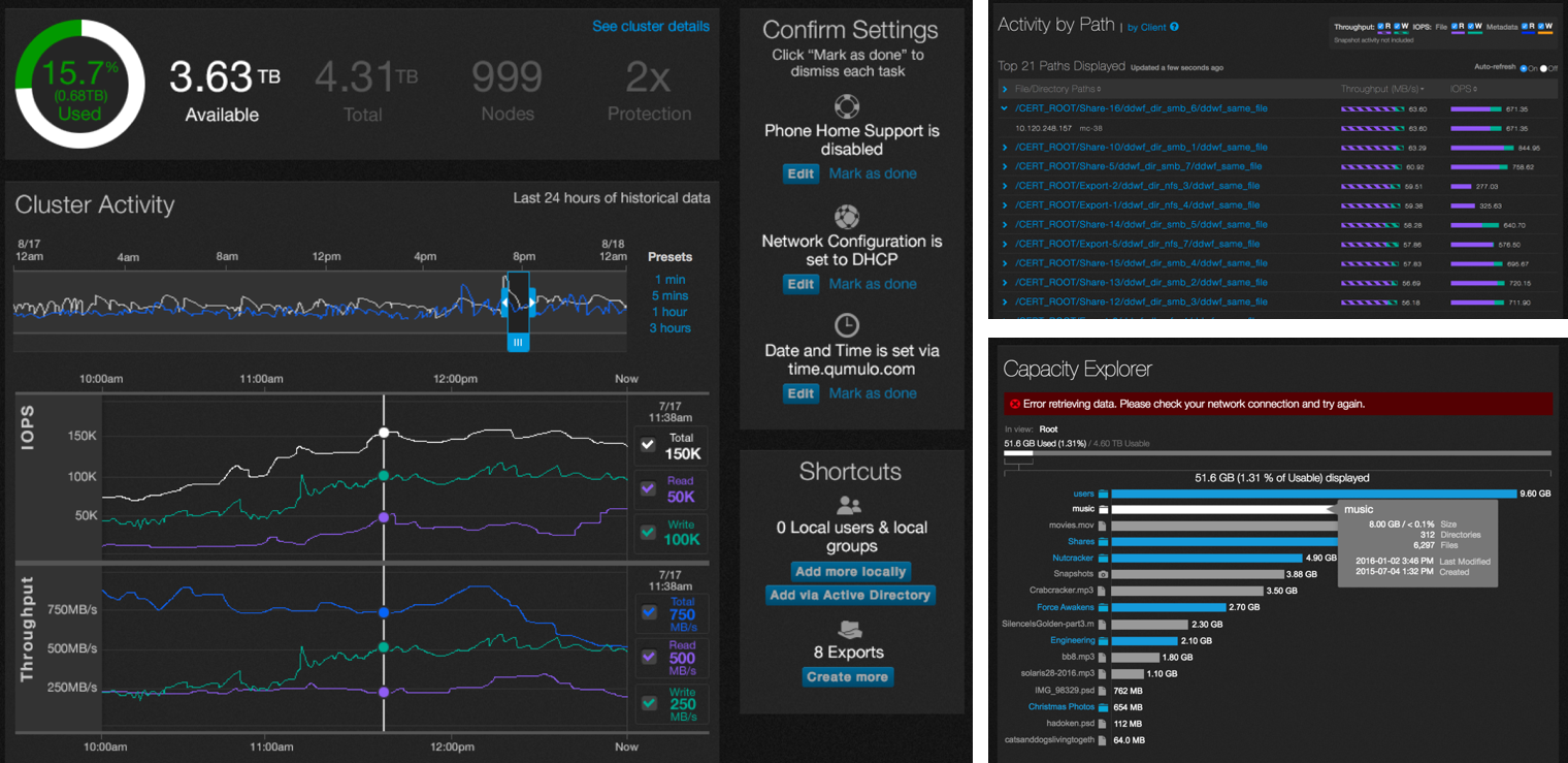 Users had to flip between capacity and performance separately to get a full story of what was happening with their cluster. I designed the Integrated Analytics interactive graph as an insights map that offered a quick way to check overall system status with the ability to explore the filesystem at a glance from the bird’s eye view and zoom into details. Combining capacity and performance insights into one view has never been done before by other storage solutions. This combined view became the most used interactive graph and was Qumulo’s first utility patent for visualizing insights in which I was an inventor (US Patent 20160371297).